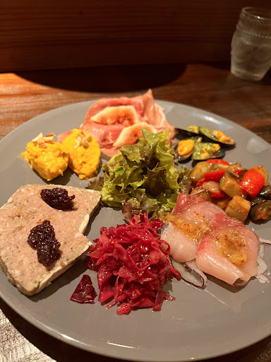 ワインのお供にいただいたのは ◆前菜盛り合わせ2人前 ・生ハムいちじく ・カボチャとマスカルポーネ ・パテドカンパーニュ ・紫キャベツのマリネ ・鰤のカルパッチョ ・カポナータ ・ムール貝 華やかで美味しい前菜、特になめらかでクリーミーなカボチャとマスカルポーネ、これは絶品♡