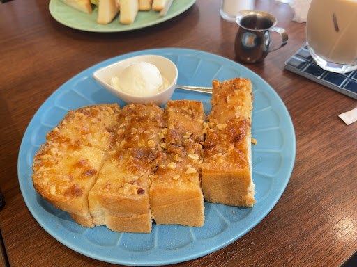 クラッシュアーモンドが散りばめられたバター染み染みのトーストを添えられたホイップクリームやメープルシロップで食べるんですが、これがクセになる美味しさ♡