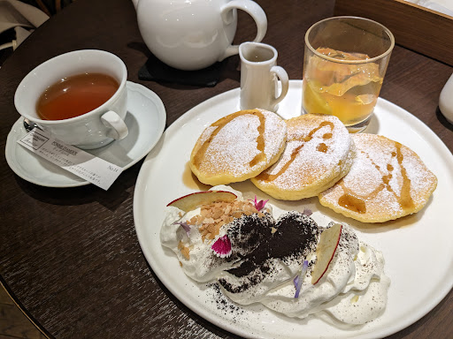 Read more髙島屋にある高級紅茶屋さんのカフェということで一定程度美味しいのは確約されてると思って行ったけど、パンケーキが期待よりさらにめちゃくちゃ美味しかったです! 生地は卵感強めのもっちりで十分美味しいけど、それに輪をかけてすごかったのが山盛りのクリーム!!! めちゃくちゃたっぷり出てきて第一印象は食べ切れるかな……?と思ったんだけど、一口食べてびっくり!!めちゃくちゃ軽くて美味しくてこれはいくらでも食べられるやつ!と直感!!! ホイップどころか生クリームでも重ためはちょっとな……と思う今日このごろですが、ここのクリームはふわっふわのミルククリームで、しかもバニラ?ほんのちょっと洋酒?わからないけど明確に牛乳だけじゃなく何かが香って、明らかにひと手間加えられてる高貴なお味!もうこれだけで感動!! しかもそのクリームに繊細なトッピングがされてて、さらにそれが単なる飾りじゃなくうすーいパリパリしたフレークみたいなの(名称不明)やドライアップルが食感のアクセントや味変要素になって、さらに奥深い!!!もう恐れ入りました。いろんなカフェでケーキやらスイーツやら食べてきたけど、この味も見た目も繊細で美しくて美味しいというのはなかなかお目にかかったことがないレベル。完璧。 そしてメニューを選ぶときに何も気に留めていなかったゼリーが………美味しい!!!めっちゃしっかりプルルンとしつつ滑らかで、お味は手土産でもらうようなめっちゃいいりんごジュース(クリアタイプ)そのもの!おまけというには失礼すぎるクオリティ&ボリューム、そして甘いパンケーキ&クリームとさっぱりゼリーのバランスがまた良すぎる! もうほんと素晴らしすぎた。大当たり。フレンチトーストと迷ってのチョイスだったので、今度はフレンチトースト食べに行きます!!!
