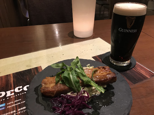 ビブグルマンに掲載されたイタリアンシェフが腕振るっていらっしゃるDECO。 オーナーに伺うと、当初はオーナーが好きハンバーグ、ロコモコ、BBQスタイルであったが、イタリアンシェフを招いてからイタリアン主体に。 情報が違っているという事で納得。 お話も終わったところで、オーナーにオススメを伺ったところ、「パスタ」とピッツァですねと。 「豚肉とモッツァレラチーズのトマトソース」パスタ 「三元豚の燻製 ポテサラのソース」 「ギネスビール」 上記3品を先ず頂くことに。