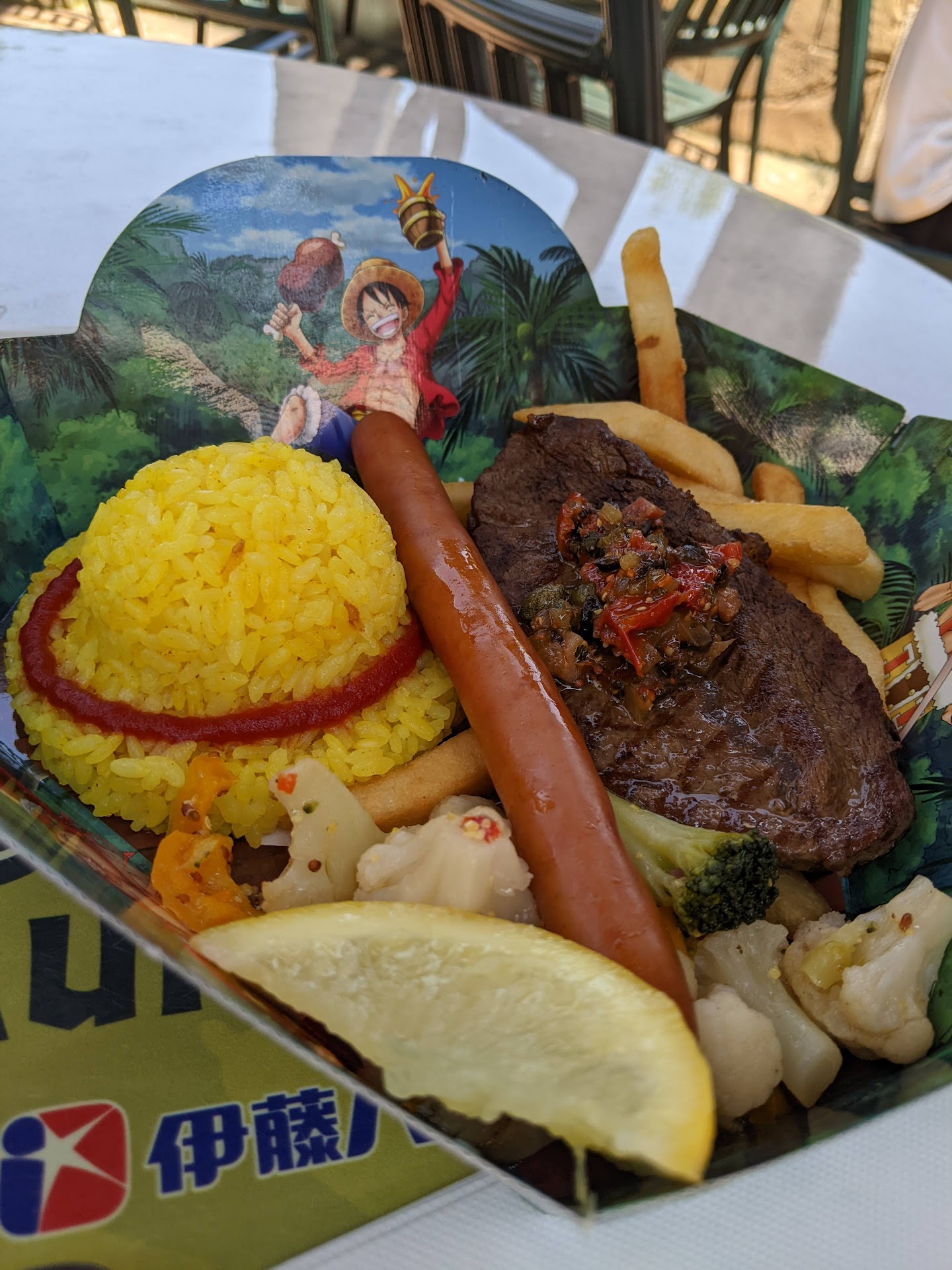 Discovery Food: The 3 combo plates themed after the anime One Piece, are between 1,790 to 1,990 yen. They have a fish, chicken and beef combo plate. Theme park pricing and I went with Luffy's meat plate: Rice, Corn, Broccoli, and two fatty tasty pieces of meat. Just enough food to take down hunger and not feel bloated.