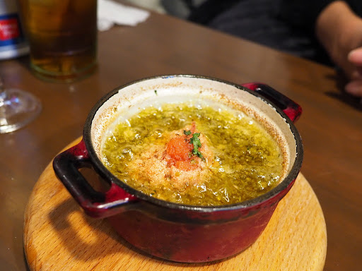・明太子とポテトのアヒージョ(600円) アヒージョでこの組み合わせは初めてです。 グツグツと煮立ったオイルが少し落ち着いてから、ライ麦の入ったパンに乗せてパクつきました。 このパンがまたふわふわで美味しくって! オイルもまだまだ残っていたのでパンをおかわり〜!(笑)