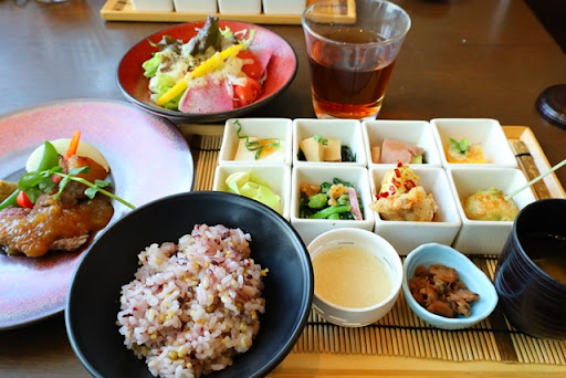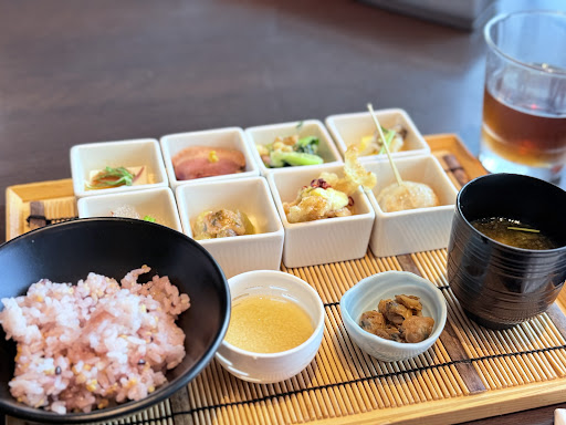 その後すぐに彩り10種のお惣菜と十穀米ご飯、サラダが出てきます。 一口サイズのオカズですが見た目も鮮やかで美味しそう!実際美味しい!薄味ではなくしっかりと味があってご飯が進みます。お野菜メインかと思いきやしっかりお肉もあって満足感もアップです。 サラダもドレッシングがしっかりかかっていて美味しいです。油っこいとかではないドレッシングなので罪悪感も少なめ。 ご飯、お味噌汁はお代わりし放題なので男性もガッツリいけちゃうかも。でも、店員さんが忙しそうでなかなか捕まらない。2分くらい手を挙げてたかも。忙しい中なんか申し訳ないです。おかわりごときのために…! 面倒ならお櫃で持ってきてくれてもいいですよ…!