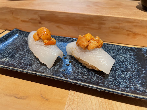 ☆雲丹のアテバージョン・・・ビジュアル最高! ミョウバン感が全くない、甘い雲丹とイカ、風味抜群の海苔で巻くコラボは最高のアテになりますね。