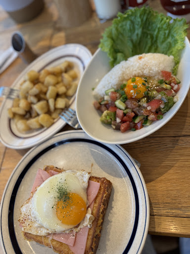 The potatoes and poke bowl were brought out about 5 minutes after ordering, but the potatoes were already lukewarm. It took nearly 10 more minutes for my French toast to arrive, and I was immediately disappointed by its appearance. The portions were minimal, and the quality of the ingredients was very low. The poke bowl tasted bland, and we could tell the sesame oil was old. We had to add salt to the poke bowl to make it palatable. The French toast was just okay, but for the ¥1500 it cost, I could have enjoyed two massive bowls of ramen elsewhere and been full with just one.