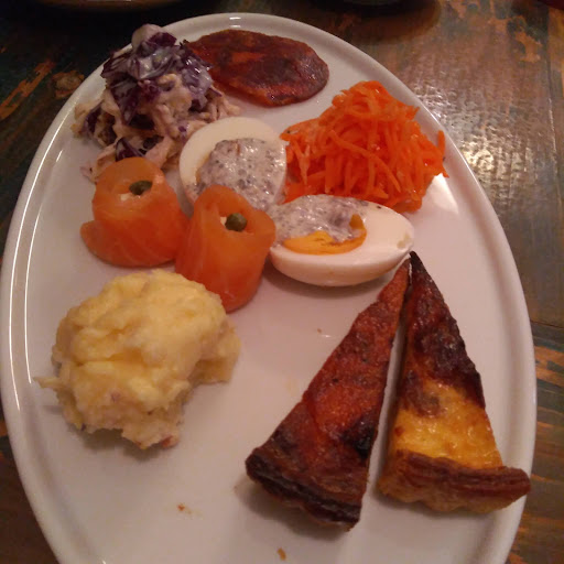 One of the best meals I've ever had. We started with mixed hors d'oeuvres, slices of quiche with flaky buttery pastry, salmon wrapped round cream cheese, chicken with cabbage, chorizo, grated carrot vinaigrette, amazingly creamy mashed potato, goat's cheese and figs, halved boiled egg with herb sauce. I had the fish planter, which was sea bream grilled perfectly, accompanied by sliced roasted garlic, and a sauce with yellow and red peppers. The flavours were incredible! My dinner companion had thick slices of roast beef with a perfect pepper sauce. Then we had the squid ink paella, also delicious. This restaurant is an absolute gem and I feel lucky to...