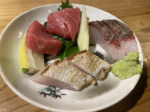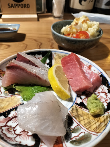 この日は休日で暇人の私は南森町在住の知人から 教えて頂いた大阪天満宮近くにある人気立ち飲み店 『立呑処えもん』さんにお邪魔しました。 『立呑処えもん』さんはオープンして5年目になる 南森町・大阪天満宮界隈では有名な立ち飲み店で 日本料理の調理経験が豊富な店主が作る自慢の海鮮料理が美味しいと評判の人気店。 場所は大阪天満宮東神門の東側の通りにあるビルの 1階にある路面店でJR大阪天満宮駅から徒歩2分、 大阪メトロ南森町駅から徒歩4分の駅近店です。 お邪魔したのは18時頃でこの日は朝から天気が 悪かったからか先客は少な目で私は入口近くのカウンターに陣取りました。 店内はシンプルですがスタイリッシュでお洒落な 内装でとても落ち着いた雰囲気です。 お店の中央にはTVモニターが設置されていて その日はプロ野球の試合が放映されていました。 キャパはL字カウンターとミニテーブル2卓、 4人テーブル1卓で20人ほどのキャパです。 立ち飲み店ではありますが椅子も用意されていて 席料300円を払えば着席可能だそうです。 スタッフは店主と女性スタッフの2人体制です。 私はカウンターにあるメニューをチェック。 フードはお刺身や巻き寿司、にぎり寿司など 海鮮料理を中心に和食系の肴が約40種類と 海鮮料理が好きな私にはたまらないラインナップ。 そして大半が400円〜1,500円とリーズナブル。 ドリンクも一通りあり良心的な価格設定です。 そして19時迄であればドリンク1杯とお刺身3種盛りor天ぷら3種盛りor本日のお魚カマのチョイスで税込1,000円のハッピーアワーセットがありました。 私は迷わずハッピーアワーセットをお願いしてドリンクは芋焼酎だいやめ水割り、フードはお刺身3種盛りをチョイスしました。 そして最終的に芋焼酎だいやめ水割りをお代わりしてフード4品を追加オーダーしました。 【ハッピーアワーセット ¥1,000】 ⚫︎芋焼酎だいやめ水割り ⚫︎お刺身3種盛り 長崎産本マグロ・カンパチ塩たたき・福井産沖ボラ (追加オーダー) ◉芋焼酎だいやめ水割り ¥528 ◉長芋入りポテトサラダ ¥429 ◉きびなご天ぷら ¥528 ◉えもんの出汁巻き ¥748 ◉おまかせにぎり寿司3貫 ¥693 熟成鯛・本マグロ・筋子 お刺身3種盛りは長崎産本マグロ,カンパチ塩たたき,福井産沖ボラとなかなか渋いラインナップ。 特にボラのお刺身って関西では珍しいですね〜 ボラは水の汚れに強く都会の河口で普通に見られる 魚なので関西では殆ど市場に出回ってないですね〜 ところが綺麗な海で育ったボラのお刺身はとっても美味しいのだそうです。 今回のボラの刺身は福井沖で獲れたボラだそうで、 実際食べてみるあまりに美味しくてビックリ(@_@) 最初はなんてことないと思っていましたが正直もっと食べたかったです。 あと本マグロもカンパチ塩たたきもクオリティは素晴らしく美味しくて大満足の内容でした。 長芋入りポテトサラダは滑らかな食感のシンプルな マヨ味のポテサラですが長芋のサクサクっとした 食感とネバネバっとした食感がいいアクセントに なっていてクセになる美味しさです。 お酒のアテとして秀逸な逸品ですね〜 きびなご天ぷらはカラッと揚がっていてきびなごの 独特の苦味が美味しいんですよね〜 基本塩で頂きましたが天つゆが結構出汁がきいてて 残った天つゆはそのまま飲んでしまいました(笑) えもんの出汁巻きは出汁がきいたぷるんぷるんの 出汁巻きで優しい味わいで美味しいかったです! 結構ボリュームがあったので腹パンになりました...