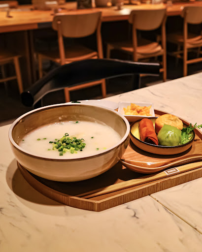 鯛のお粥は湯葉と干し貝柱、ねぎ、生姜が入っていて穏やかな出汁の味がいい 鯛のお刺身は中華粥に入れて、ほんのり温かくして食べるとお粥に合って絶妙に美味い 付け合わせのチンゲン菜は箸休めにちょうどいい 白のナチュラルワインとペアリングはピッタリ