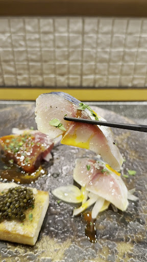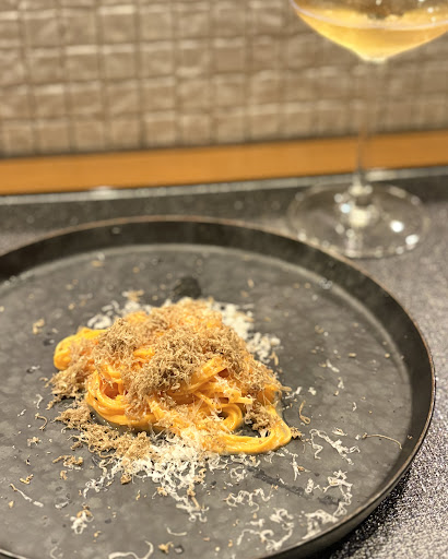 ブルスケッタはキャビアがたっぷり乗っているのが驚き。カリっとしたブルスケッタとトリュフの香り、キャビアの塩味のハーモニーが素晴らしかったです❗️鯖は素材の旨みが強く、カツオは皮の焼かれた香ばさが光る一品。スパークリングワインとの相性が素晴らしい前菜達でした。