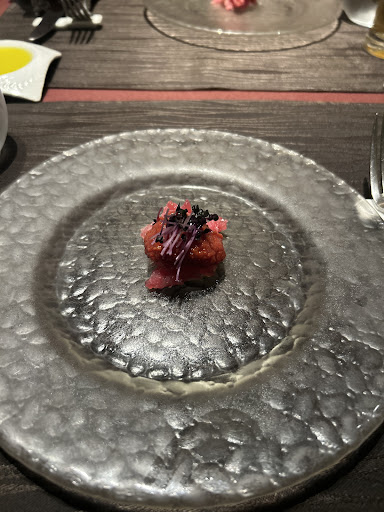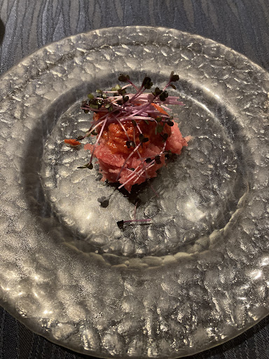 一つ目はマグロなんですが、トマトのソースが乗ってます この2つの相性がこんなにいいとは思わなかったです また、二つとも単体でめちゃくちゃ美味しいのに、一緒に食べると自然と笑顔になります