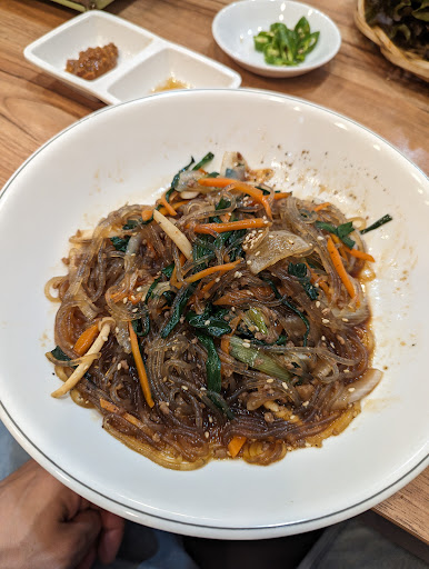 The japchae was delicious. The kimchi assortment was really good. Not super spicy but with a real good fresh crunch to each type of kimchi. (Cabbage, zucchini and radish).