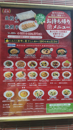 Read more普通に王将です。関西圏産まれ、育ちならなんら珍しい事もありません(笑) 近所に住んでるおじさん一人暮らしなので重宝してます。特に美味しくも無ければ調理が下手、というわけでもありません。場所柄外国人観光客や労働者おじさんが多く、家族連れは少ない感じ。時間帯によっては非常に待つ事もありますので事前電話で持ち帰りをよく利用します。 店内メニューは・・・少な目かな?意外と知られてませんがグランドメニューでも店舗によって取り扱いがあるなしがありますがここは少な目。もちろん店舗限定の定食(セット)メニューも少し少ないです。オリジナルもないかな。 外国人の店員さん多めですがコミュニケーションに問題はありません。ただ恐らくですが忙しい時間帯でも餃子を先を見越して焼いておくってのはやってないので忙しい時は結構待ちます(もしかしたら昔と違って王将全体で禁止のルールでもあったらすいません) あとはメニューから瓶ビールがなくなったのは痛い。生ビールはコスパ悪い感じがします。でもチューハイは安いかな。最近はジャストサイズが普及したおかげで王将での「飲み」も楽しくなってきた今日この頃なので痛いです。