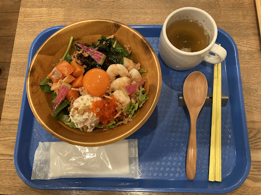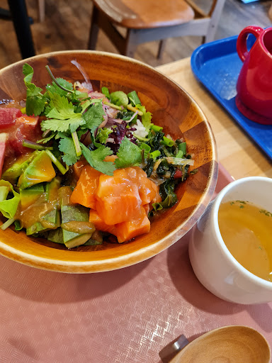 Read moreランチに訪問。 陽気でトロピカルな旗と看板に誘われてふらふらと。 屋内に10席ほどと、屋外にも10席ほど。 BGMのハワイアン音楽と、明るい雰囲気がまるでハワイのような気分を演出する。 また、親切で明るい店員さんの対応が好印象。 ランチは自分で好きな具材を選べる「ポキボウル」に、「ロコモコ」、「モチコチキンプレート」のみ。 ディナーはアラカルトで様々なハワイアンメニューが頼めるスタイル。 この日は気になった「ポキボウル」を。 ベース、メイン、サブ、ソース、トッピングの中から好きな物を、決められた数量組み合わせる事ができるシステムで、組み合わせは1,000通りにもなるのだとか。 紙に自分の好みを記入するシステムなので、焦らず選ぶことができる。 ライスの代わりにベビーリーフを選ぶことができるので、糖質制限中の食事などにもお勧め。 とりあえずベースのライスに、メインを「鮪」と「サーモン」、気になったサブに、「オリジナルソース」と「フライドオニオン」を組み合わせた物をオーダー。 今回はしなかったが、追加料金を払えば具材を追加することも可能みたい。 1-2分ほどで料理が到着。 ご飯が見えないほどの具材が乗ったどんぶりに、スープのセット。 想定以上の具材の量に驚かされる。 とりあえず混ぜてから一口。 温かいご飯に、醬油ベースのタレ。 ごま油が香るコクが強いタレが具材の数々とマッチして美味。 トッピングの内容にもよるだろうが、色々な食感が口の中で心地良い。 鮪とサーモンは魚特有の香りを少し感じるが、ソースが良い仕事をしているので、美味しく食べられる。 850円という価格を考えるとかなりのお値打ちに感じる。 うーん。 個人的にはなかなかの満足度。 注文してすぐに出てくるのも評価が高い。 なにより、海外に行けないこんな状況で、少しでも海外っぽさを...