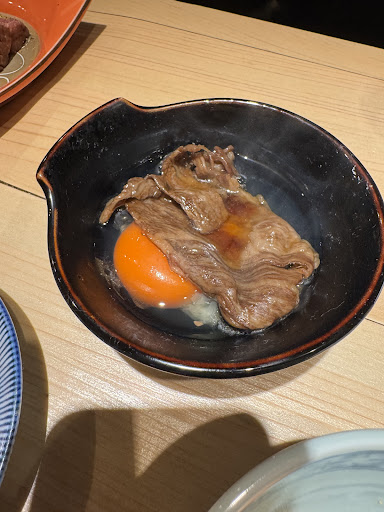 ・和牛一口バタすき こちらは焼いた状態のものを卵黄にダイブしてくださります。 食べるや否やまず香るのがバターの風味。 そして肉の旨みが堪能できます。 こちらも柔らかいですが脂っこくなくて食べやすいお肉ですごく好みでした!