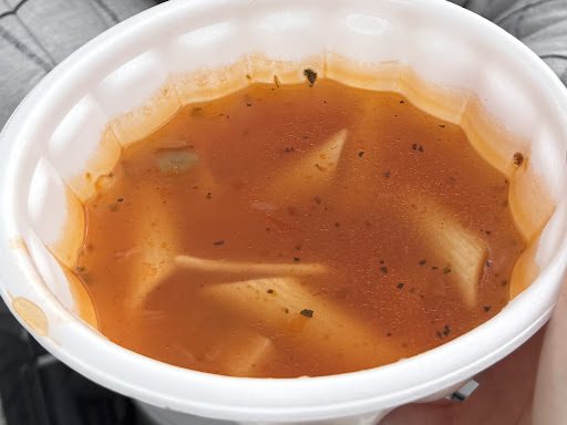 ランチは食べれなかったが、イベント開催中だったのでこちらのお店のスタッフさんが外でも飲食ブースをされていたのでペンネラタトゥイユをいただきました。 味は薄かったが、寒かったので身体を温めることが出来て良かった。 購入してすぐに通り雨に合い、添付写真2枚目の屋根の下のベンチで食べていたらスタッフさんにここは調理スペースで休憩スペースではないから出て行くように言われ、雨が降っているのに屋根の外に追いやられました。 実際に何も買わずに休憩している人はいたが、こちらのお店で購入した人にまでそんなことを言うのかとガッカリしました。 近くに舞洲のゴミ処理場があるから汚染された雨が食べ物にかかった気もして...