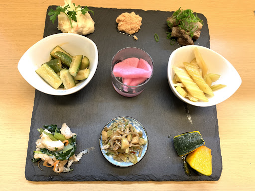 美味しいお酒に合わせるアテは、もちろん気になっていたこれ。 ■大将自慢の一品盛り合わせ 1,000yen スレートプレートに9種のアテが盛られて登場。 いやぁ、なんとも素敵なビジュアルですね♪ 大将ご自身もお酒がお好きなようで(1杯飲んでいただきました)このあてのチョイスは秀逸。 ポン酒に合うもの勢揃いで酒がすすみます、注文して正解。