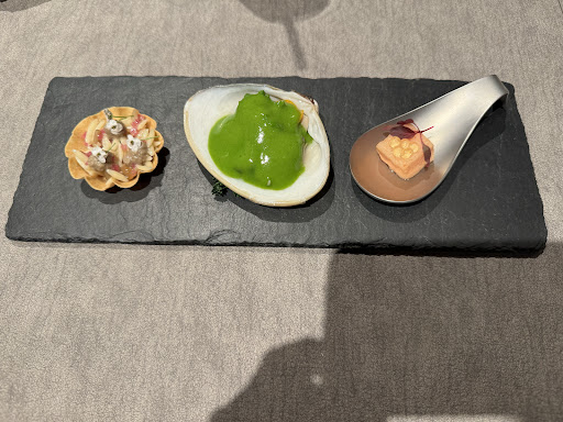 [☆お料理 ★お酒] ☆ -entrante- 始まりの小さな前菜 ・フルーツトマトと卵白 トマトピューレ ・イカ墨とじゃが芋 ホタルイカ ガーリック ・あおさのり アンチョビ 鱒の卵 ★ ロータリ エクストラ・ブリュット アルペ・レジス 2016 イタリア 白