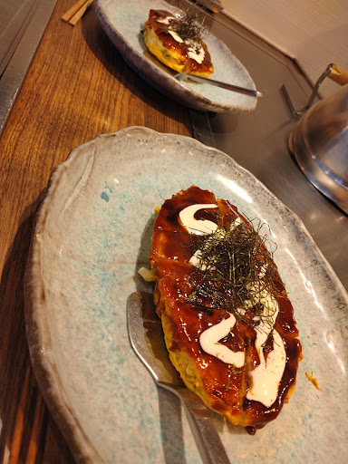 お好み焼きが人気の鉄板焼屋さん。 お好み焼き以外も全て最高に美味しい! お好み焼きは奥様が、それ以外は旦那様が焼きの担当をしています。 ①黒豚サラダ 黒豚のスライス肉を鉄板で熱を通し、一口大にカットしてサラダの上に。サラダは千切ったサニーレタスやカイワレ、香草などのミックスに柑橘系オリジナルドレッシングがかかってます。さわやか。半熟目玉焼きとジャガイモを粗マッシュして焼き固めたものを乗せてます。混ぜていただきます。これだけでメインクラス。 ②ヤングコーン 優しい甘さがあり、芳ばしく、ひげも美味しくいただます。 ひげ食べられるんだと妻と感動。 ③賀茂茄子 厚切りの賀茂茄子をソテー、醤油ベースのタレで味付け、青海苔をまぶして、目玉焼きを乗せて完成。蒸し焼きされた賀茂茄子はトロトロ。焼きでもこうなるのかと発見がありました。 器に残った卵は青海苔をちらして焼いていただけます。 臭みなく美味しい卵です。茄子の風味が強く残ってます。 ④ホタテ 前回も頼んだ肉厚のホタテ、甘くて繊維が太くて美味しい。 前回の方がもう少し厚くて、魚介臭さは無かったですが、その年その年の当たり外れなのかもしれません。十分美味しいです。 ⑤エビのXO醤炒め エビの頭は落とされ、桜海老が添えられます。 身がしっかりしてて美味しいです。味付けは濃すぎず薄すぎず絶妙。 ⑥カイノミのステーキ 前回も頼んだカイノミ(ハラミ)。ヒウチ(腿)と悩みましたが、また、カイノミに。 柔らかいミディアムなお肉。とても美味しい。 タップリのニンニクに岩塩、粒マスタード、水菜でいただきます。 ⑦お好み焼き(エビ・スジ) 前回は二人で1枚。今回は一人1枚いただきました。 刻まれたキャベツ一欠片ごとの間も生地がふっくら膨れて、食感と口の中での解れ方が繊細で美味しい。この日は卵の風味が強かったです。混ぜ方なのかな?旨い! 作り方を勉強したい。エビは生地の中でふっくら、スジは柔らかく美味しく炊かれてます。 ⑧追加の蓮根 ホクホクシャクシャク。 みずみずしくて美味しい。