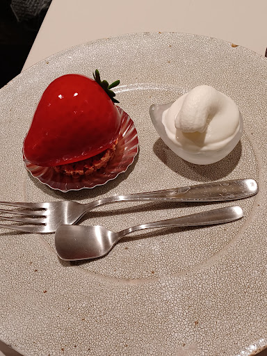 イートインでは、ソフトクリームと盛りつけてくれてあるのが嬉しいですね。 私は「ラピヌ」を頂きました。 一番下は、タルト生地じゃなくてコーンフレークをチョコで固めた風(イチゴ味?嬉しい!)で、フワフワのスポンジがあり、その上ベリーソース。ホワイトチョコムースは、濃厚で甘過ぎずベリーソースと良く合います。ただ、四種類を一緒に食べると何がなんだか分からん感じになってしまったので、それぞれ別々にベリーソースをつけて食し、楽しみました。(これは、これでなんか得した気分。が、パティシエの手間暇を無下にしてしまっている?!) 紅茶は、種類が分かりませんが、 しっかり芳香のある美味しい茶葉でした。カップも暖かいのを出してくれたのがうれしい。ポットサービスだったのです、なんと南部鉄器の藍花のポット!美味しいはずです。お湯を南部鉄器で沸かしているのかは不明ですが(聞けば良かった)、これはもっと知られていてもよいのでは?! ツレの珈琲は、「普通」とのことでした。