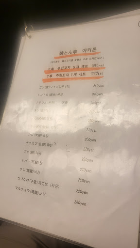 유튜브 추천받고 멀어도 버스타고 방문한곳입니다.오늘가니 손님이 저희밖에 없더라구요. 오시자마자 저희가 "일본어를 못하는걸 아시고" 한국어 메뉴판을 주셔서 주문을 하였습니다. 조리하시는분께서 서비스 어쩌구 소리치시면서 빠르게 보노스프 찬물에 갠 것 같은 찬 스프를 주시더라구요? 일본어 못하시는건 아셨을거고 금액관련된 이야기를 이때라도 하셨으면 저희는 인지라도 하고 있었겠죠? (이렇게 차게도 스프를 먹는구낰ㅋㅋㅋ 하면서 서비스인가 이러면서 먹음) 꼬치구이7종 + 하이볼 2잔 + 맥주 1잔 + 치킨완자1개 = 6,450엔 가격 더해보니 겨우 4천앤 남짓긴데 계산서는 6,450 원이 나왔습니다. 카드결제하고 나와서 숙소로 가다가 아무리 생각해도 이상해서 다시 가게로 돌아가 따져 물었습니다. 오죽했으면 다시 갔을까요. 그러니까 한국어 메뉴판을 다시 가져오시는데 서비스 차지가 붙을수 있습니다. 라는 앞장이 달린 메뉴판을 보여주더라구요? 이는 저희가 받은 메뉴가 아니라고 생각하는데 왜냐면 이 장에 대한 설명이 주문을 받을때 설명이 없었고 처음 받았을땐 못보던 장이었기 때문이지요. 메뉴판 야바위 같은 마법과도 같은 순간이었습니다. 저희는 핸드폰으로 구글 통역을 해서 의사를 전달했음에도 그냥 일본어를 하시며 손가락 5개를 들어올리시더라구요. 인당 5개면 500엔인가 해도 1000엔일텐데 그래도 계산은 맞지 않았구요. 더 따졌으면 설명을 정확히 일본어로 해주셨을까요? 한국에 메뉴판을 만드실 정성이 있으셨다면. 그런 혼란이 발생하기 이전에 추가비용이 있다면 그부분과 금액을 적어두고 페이지를 읽어보시라고 안내라도 하는것이 식당 운영에 기본이 된다고 생각하는데요. 일본에서 정말 친절한 가게들이 있어 여행에 좋은 기억을 가지고있었는데 이러한 운영방식도 용인되는 형태인지 궁금합니다. 보는눈이 많고 일본어를 잘하면 그때는 잘 설멸은 해주시는지 매우 궁금하며 방문하시는분들은 이점을 꼭 참고해 주시길 바랍니다.