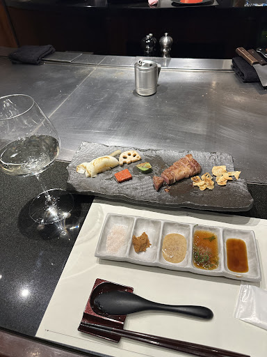 The atmosphere is refined yet intimate, with warm lighting, polished wood interiors, and a seating arrangement that allows guests to watch the chef’s skillful work up close. From the moment we sat down at the teppan counter, we knew we were in for something special.