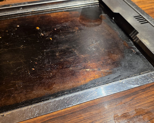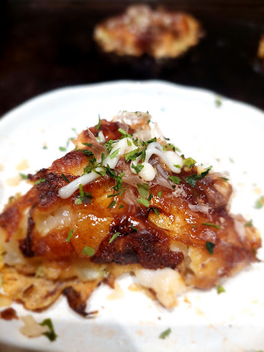 So, straight to the cons. 1) Main way of ordering is a LINE SNS / Instand Messenger / Social Media app, which for my Samsung / Android device doesn't work and for my Wife's iPhone worked unreliably. Fortunately, Service can take the order in classic way, but this caused some discomfort in first minutes of fighting with the app. 2) Like mentioned earlier, the food looked good and tasted okay, but - just okay. Though it wasn't even close to Okonomiyaki we ate in Hiroshima, so comparison would require to say "disappointing". Worth pointing out was the fact, the amount of meat in both meals was minimal. If "pork" is in the name of the meal, I would expect to be able to recognize it in the meal. 3) There are standard sauces for Okonomiyaki at the table, like the mayonaise one. But they are kept in warm and near the heated part of the tables so we (with sensitive stomachs and IBS) finding them almost completely solid just passed using them. Yeah, I couldn't even push one of them out of the bottle... 4) The restaurant is open to smokers. For some it might be okay, especially regarding they sell alcohol, but there is no "non-smoking" zone designated, nor "smoking-only" zone. You can imagine, the smoke from another table was quite annoying. Only one comment in the google reviews mentiones smoking, and there is almost no information in the restaurant visible to foreign customers. The Service does not tell during entry, this is a fully smoking place. But it's our fault I guess we missed it or didn't ask. 5) If smoking doesn't give you cancer, the heating tables will. I never saw something like this ever in Japan, even in the street food izakayas. I know, this is Asia, the rules are a bit different than we expect in Europe, but this is something else even for the region... The gas-heated tables were all black from burnes. You can see it in my photo - this is not something we could have done during our dining, though we forgot to take a photo before we ate. Amount of coal burned on top of it would make Gordon Ramsay explode, or Magda Gessler throw dishes in the air. It's like a year or more of burn collection. Add the cigarettes residue from smokers and you can imagine chemistry of it. Like someone briefly scrubs it once a day and that's it. No wet towel, no detergent, no polishing, no nothing. We ate anyways, "travel experience" as justification, but somehow random Okonomiyaki restaurant in Hiroshima had all the tables and heaters perfectly cleaned even though they had a 45 minutes waiting queue. So it ain't impossible.