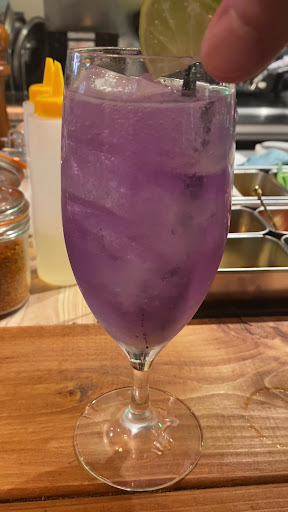 まずは「キミニ変化ヲ」ジントニックエンプレス?トニックを入れると色が変わる。 動画を撮ったけど写真しか載せれない笑 濃い紫が薄いピンクに変化!! さっぱり飲みやすい!
