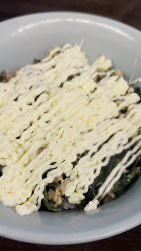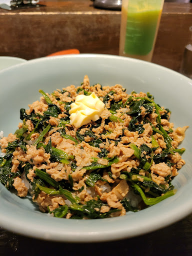 ・ポパイ丼 どんぶりいっぱいに敷き詰められたほうれん草と豚肉の炒め物。炒めてしんなりしてるからかなり量は減ってるはずなのにご飯がほとんど見えないくらいに敷き詰められたほうれん草。この丼ひとつ作るのにいったいどれ程のほうれん草を使っているのか、、、こちらの丼は白ごはんの上に炒めた豚肉とほうれん草を乗せて、以上!って感じのめちゃくちゃシンプルなお料理。しかし侮ってはいけません。炒め具合なのか、ご飯の炊き具合なのか、味付けなのか(シンプルに塩コショウだと思うけど)、、 このポパイ丼、本当に美味しいです。そしてこちらのお店マヨネーズのトッピングが無料。とゆうか卓上なマヨネーズが常備。基本マヨネーズ使わないんですがこのお店に来た時は別腹。マヨラーと化します笑(いや、この日は少しかけ過ぎましたが) 更に!こちらのお店は単品でご飯もの頼むと豚骨ラーメンみたいなスープがセットでついてくる!(みたいとゆうか多分ラーメンのスープ笑)このスープがまたご飯に合うのよ。 色々メニューはあるけど、やっぱりダントツでおすすめはこのポパイ丼!マヨネーズかけてちょっとジャンクやけどほうれん草でプラマイゼロ。むしろプラス☆いつ食べて...