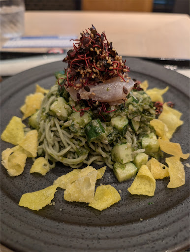 戻って気を取り直し、二口目に 真鯛の刺身もほおばる。 真鯛どこの部位?!筋っぽいにも 程がある。海苔味ではあるが…、 どこかでこれ食べた事がある。 思い出した、胡瓜の入った蕎麦寿司の味。周りに散らされてある、美しく染色された黄色い揚げワンタン皮、味の無いドリトスのようでかえって邪魔な食感。上に紅蓼を乗せる必要があるのだろうか。