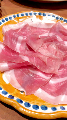 〇プーリア産 生クリームを包んだモッツァレラチーズ ブッラータと青森産洋ナシ パルマ産生ハム 本日の特選素材のかなりの大きさの青森県産洋ナシを使った前菜。 めちゃくちゃにミルキーな食感と味わいのブッラータチーズ。 そこに、熟した洋ナシを合わせるともう至福の味わい。 生ハムの塩気と洋ナシの組み合わせもかなりナイス。