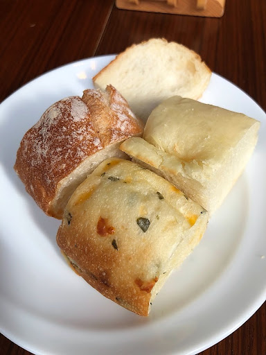 サラダを半分も食べていないのに次のパスタのサーブ。 一緒にパンも来たので、サーブ側から遠い位置にパン皿があったので手に取ると皿を掴まれて元の位置に戻される。