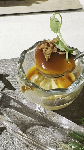 ■スープ ・マッシュルームのスープ 詰め物入りカボチャのラビオリ マッシュルームスープの中心にはぼっちゃかぼちゃのピューレがあり、お月さんのようです。 かぼちゃの甘みとマッシュルームの濃厚さが相まって幸せな美味しさ。 ラビオリにはフォアグラと鶏の手羽元。写真を撮るためにラビオリをスプーンですくっていたけれど、ボトンと落ちてスープが飛び散る失態を犯す。
