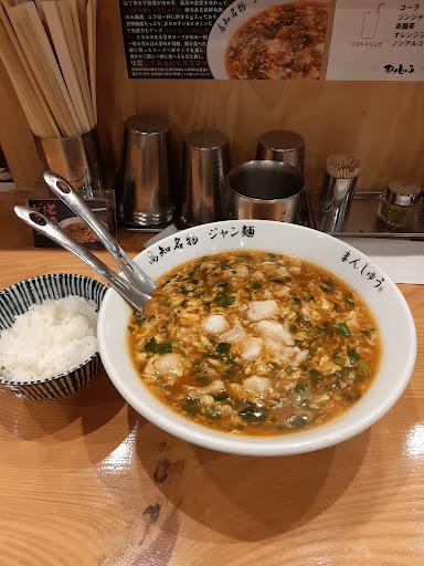 Read more今回、おじゃまさせてもらったお店は 大阪、西中島南方にある まんしゅう 西中島店 サンです。こちらの まんしゅうサン 高知名物の ジャン麺 が味わえるとのことで、前々から食べてみたいと思っていたので 今回ようやく訪問することができました。 この日、私が お店に 到着した時、時間は お昼の 12時15分ぐらいでしたが 、お店の前には 5~6組、10人ほどの行列が‥しかし 回転が早いのか10分ほどで 店内、カウンター席に 通されました。 行列に並んでいる あいだに 注文は済ませていたので しばらくして注文していた 卵落とし ジャン麺、ごはん(中)が運ばれてきました。 カウンター席で 隣の席で 食べていた 女の人が 辛い!辛い! と言って食べていたので、辛いのか‥あまり辛いと苦手かも‥と思っていたのですが、食べてみると そんなに 辛くは感じませんでした。 私が注文した ジャン麺が 卵が入っていて 辛さが まろやかになったのか‥美味しい! スープもピリッとして飲みやすかったですし、ホルモンも プリップリで美味しかったです。 ラストは 近くの席で食べていた 男の人が 最後 スープの中に ごはんを投入して食べていたのを マネして 私も‥最後まで崩さず残しておいた 卵の黄味と からめて 完食。 いやぁ~ 美味しかった 今度 来た時は トッピングで ホルモン増量や メニューに あった カレー ジャン麺 なども食べてみたいな と思いました。 美味しかった です ごちそうさまでした。また 寄せてもらいます ...