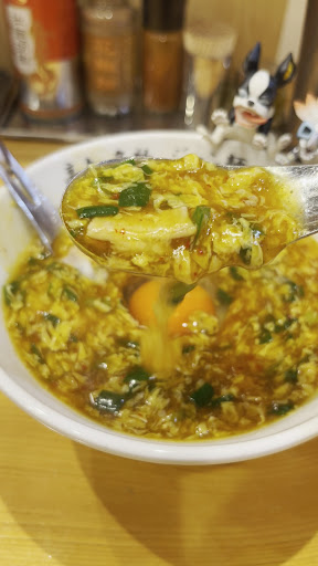【スープ】 まずは餡だけをひと口… んまっ!!!! とろみのある餡には溶き卵の甘みとホルモンの旨み、ニラの刺激がたまらないハーモニーを醸成!