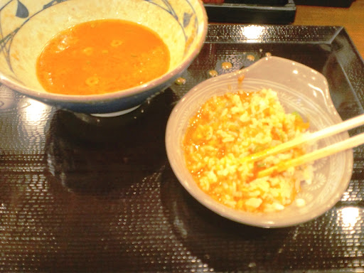 終盤に麺を食べ終わるタイミングで、今度は残ったおつゆを付属の白ごはんに混ぜて、リゾット風にしていただきます。 おお、刻まれたトマトが丼の底に沈殿していたせいで、今度はなぜかイタリア風リゾットみたいになってるやん~