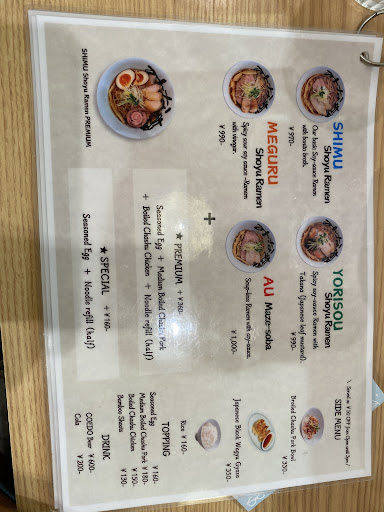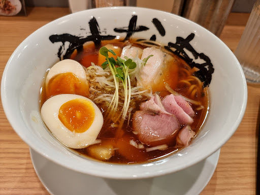Read moreなんばウォークの地下鉄四つ橋線「なんば」駅の北改札口から近い場所にあり、以前は台湾まぜそば「麺や マルショウ」があった場所。同店が閉店した後、今年(2023年)4月に新装開店した。 開店後しばらくは、店前に10人前後の行列が絶えない状態が続いていた。昼休みの貴重な時間をラーメンの待ち時間で過ごすのはもったいないと、行列を横目で見ながら新店鋪の味が気になりつつ過ごしていた。 最近になって、ようやく行列も途切れて来たため満を持して訪店。 訪れた時間は午後12時10分とまさに昼時だったが、待ち人数は自分の前に1人だった。待っている間に店員さんがメニューを配ってくれた。 「さて、何を食べようか...」と渡された2種類のメニューに目を落とすと、これが見にくいのなんの。(汗) まず、一つ目のメニューは濃い青色の波模様(?)のバックに、ラーメンメニューが黒文字で何故かS字にカーブしてランダムに書かれており、読みにくいことこの上ない。もう一方には、炙りチャーシュー丼や餃子、白飯等とラーメンがセットになったメニューが書かれているのだが、何故かこれらセットメニューの値段はどこにも書かれていない。今まで、見たメニューの中でも、見にくさと不親切さではトップ3に入るのではないかと思う。 気になるラーメンの種類は、簡単に言うと醤油ラーメンとまぜそばのみ。ただし、醤油ラーメンは3種類のバリエーションがあり、店を代表するラーメン「清め・染(しむ)醤油らーめん」をはじめ、ラー油とゴマ油、高菜が入った「清め・循(よりそう)醤油らーめん」、ラー油と酢でサンラータン風の風味を出した「清め・環(めぐる)醤油らーめん」がある。しかし、最近のラーメンは、どうしてこうも複雑で読みにくいネーミングにするのかわからない。 新規オープンから月日が経っていないこともあり、店内は清潔感がある。壁はアイボリーに統一され、カウンターは白木で明るく上品なデザインの好感度は高い。二人掛けテーブルが3台(計6人)、カウンターは8人掛けのため14人で満席だ。 店員さんは店前で並んでいる時から席への案内、会計に至るまで笑顔があり、接客の印象は◎だ。 さて、肝心の味について。自分がオーダーしたのは、まずは初回ということもあり、店の看板ラーメンの「清め・染(しむ)醤油らーめん」(930円)に炙りチャーシュー丼(250円)のセット(セット価格1130円)。ラーメンは、おそらく鶏ベースに鰹節をアクセントに効かせた出汁で醤油ダレを割ったスープに中太麺を合せており、トッピングには薄切りのチャーシュー、鶏チャーシュー、メンマ、白髪ねぎにカイワレが乗る。 丼は茶碗1杯分の白飯に胡椒が効いたサイコロ状のチャーシューとタレが茶碗を覆うようにトッピングされていた。 ラーメンは上品なスープが中太麺によく絡み、麺自体の味も良い。しかし、スープは良い言い方をすれば確かに「上品」なのだが、別の見方をすれば「アクセントに欠け特長が乏しい」。よって、これといった個性や強烈な印象はない。また、麺が香りもよくコシもあり旨い分、スープが負けている印象だ。カウンターには胡椒、七味等調味料の類は一切置いていないので、スープの風味変化は不可能。店によると「鶏チャーシューに胡椒が効いているので、それがスープに溶け出す」との言い分だが、それに気が付くほどの変化はなかった。 次に行くときは高菜とラー油の「清め・循(よりそう)醤油らーめん」を食べてみたいと思うが、さて、メニューを一周した後、1杯1000円近い“上品”醤油ラーメンを再び食べたくなるかどうかは...、...