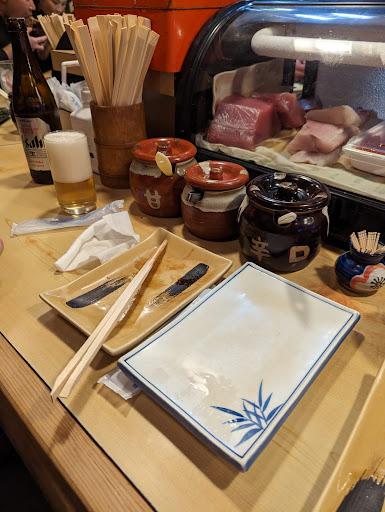Read moreThis was one of our favorite experiences in Japan. The owner is a very sweet man who patiently talked to us through my ok Japanese while serving us delicious, fresh, and affordable nigiri. In front of each customer is a set of jars for sweet sauce and spicy sauce you can brush over your nigiri, as well as pickled ginger. No menu, just pick what's in front of you inside the shelf or ask for his おすすめ / osusume / recommendation. We came here after doing the 6:30-7;30 p.m. teamlab botanical garden experience; his restaurant...