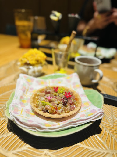 ズッパ ディ ペッシェ(ペッシェとは鮮魚、鮮魚のスープ) 赤パプリカと甘海老とフルーツトマト 伊奈鯖とカポナータと菊花(※長崎五島列島から直送される一本釣りの伊奈鯖)