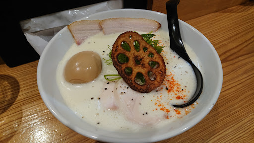 *再訪* 特製鶏白湯(限定)を頂きました。 泡立てたスープの口当たりがよく、麺を持ち上げると魚介のお出汁が香ります。塩分はややしっかり目でごはんのお供が欲しい一品ですね。 ノーマルトッピングの鶏チャーシューも柔らかく食べ応えあり。レンコンチップも香りがよく、いいアクセントになっていました。