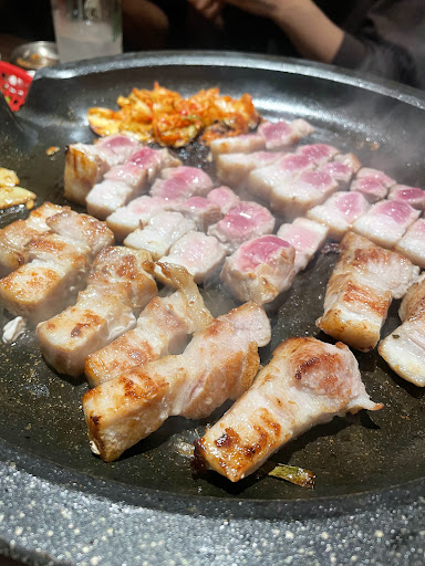 We ordered the all-you-can-eat and drink course, including the Samgyeopsal set for two. The food was delicious, and the atmosphere inside was friendly and relaxing.
