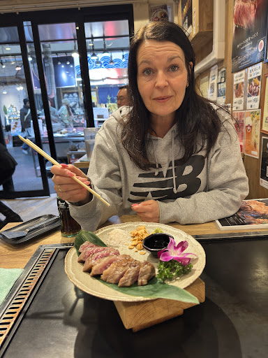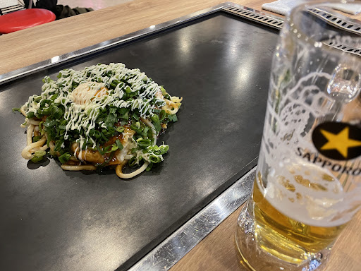 One of the restaurant on my bucket list to try while in Osaka!! Finally convinced my wife and daughter to come try this spot and it didn’t disappoint us!! The restaurant opens at 11am and is quite small and only has about 6-7 tables inside. If you want to sit right away I suggest go early when they just open. The queue could be as short as 15-20 mins up to 45mins-1 hr, depends on the time of day and how busy the market is. We went to the store at 11.40am and we had to wait about 10-15 mins. I suggest look over the menu and have items in mind to order to ask questions prior to ordering. Menu is pretty straight forward and easy to navigate. They have Okonomiyaki (I think it’s the Hiroshima style with noodles), Yakiudon, Fried rice, among other items. And they have A5 Wagyu (from different regions like Kobe and Hokkaido). We ordered the Deluxe Okonomiyaki (Pork, Scallions and Egg on top, Squid and Mentaiko Yakiudon, and Wagyu from Hokkaido (Around 120 grams for around ¥4500, not sure the exact number I couldn’t remember but around that weight and price). They’ll ask you for the temperature of the meat but you can extra sear on the grill after. The Okonomiyaki is very delicious, had great flavor and good texture (nice crunch from being on grill, cabbage is still crunchy, udon is soft and chewy) you can add toppings and sauces to your liking. Mentaiko and squid had great flavor of Mentaiko and squid is nice and crunchy. The Wagyu is super tender and really melts in your mouth!! Comes is wasabi, salts, garlic chips and ponzu sauce. Taste very delicious with just salts and garlic chips. The staff here are very friendly and helpful and very patient. They answer all of our questions and waited patiently for our order. This was a very awesome experience!! Definitely worth the money spent!! We will be back the next time...