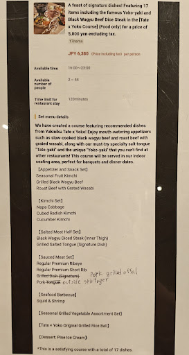 The set menu? Overpriced and underwhelming. Beef priced at 4000 JPY per 100g. See the picture of what you get. Not an authentic Japanese Yakiniku but Korean BBQ. “Pork offal” is small intestine. “Pine ice cream” is two frozen pineapple chunks.