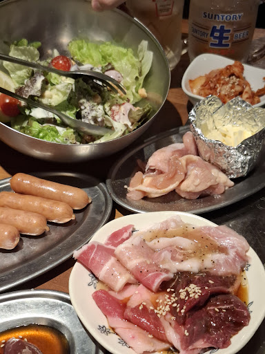 ・先出し カルビ・ハラミ・その他お肉2種(豚バラと豚トロ) ・カルビ ・ハラミ ・焼牛レバー ・ソーセージ ・豚トロ ・てっちゃん ・鶏ももチーズ ・ヤンニョムチキン ・韓国のり ・白菜キムチ ・チーズじゃがバター ・カレーロール ・シーザーサラダ ・わかたまスープ ・ビビンバ ・白飯(大) ・ミニ辛ラーメン ・ゆずシャーベット ・チョコバニラアイス ・生中 ・美酢ザクロハイ ・ハイボール ・ジンジャエール