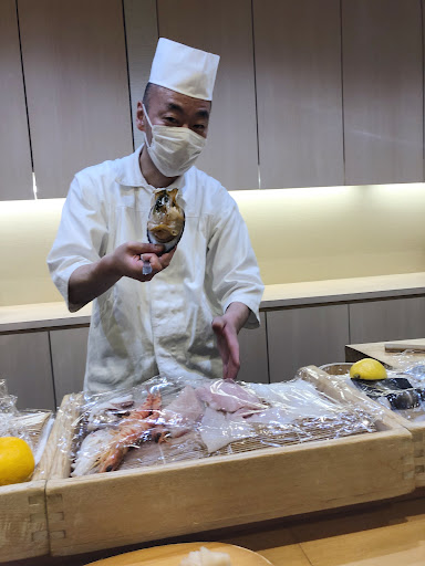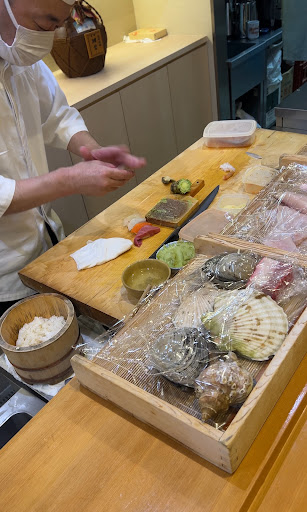 Highly recommended getting seats at the counter, as the chef prepares the sushi and sashimi in front of you, and is more than happy to have a chat and explain each course to you (including how to eat it, if you're unsure!).