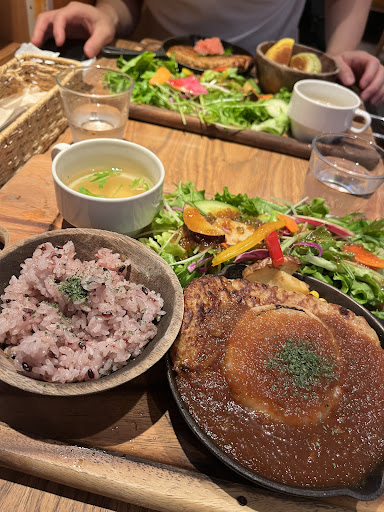 味は全体的にあっさりめ。ハンバーグは豆腐ハンバーグを思わせる軽さで、じっくり野菜と一緒に楽しむ感じ。健康にいい感じがして、満足度高めでした。ドリンクは紅茶や有機コーヒーなどが280円でセットにでき、ゆっくり過ごしたくなるカフェのような居心地でした。