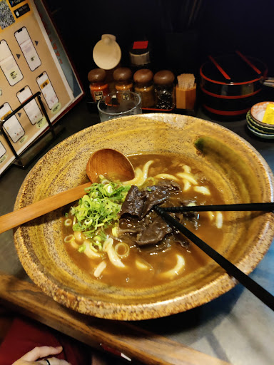 Read moreWe were here on our visit in Osaka for a few days. After the visit here, i searched tokio for another expierence, which could come close to this restaurant. Didn't accomplished that sadly. The Udon Noddle soup with beef was just perfect. In europe a clear 5/5. The atmosphere is typical and you come here to eat and not to stay, because there aren't much seats available and all of them were at the bar style cooking area. But we didn't care. The soup was great, the beef was tender and juicy. If you can read japanese you will have no problem, if not, the staff was nice to help us out, because there is no english menu available. Best is, the udon can be ordered with more noodles without extra costs. (1 serving, 1.5, 2 etc.). Basically: you pay for the soup and meat, udon is to get you happy and full for a good price. All thinks considered: Best place on our 2 weeks trip for curry udon and can easily compete with every other meal we had.