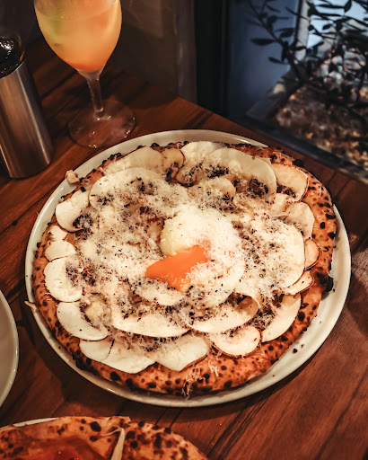 【ビスマルク】は一番人気の看板メニューとのことで、オリジナリティ&完成度に圧倒されるピザでした 生マッシュルームがこれでもか!とたっぷり♪花びらのように盛り付けられた見た目も、綺麗でテンションあがります✨ ふわっふわの雪のようにトッピングされたチーズ、半熟卵とベーコンやサラミの塩味がよく合います◎ 噛むごとに旨み溢れる中毒性の高いピザでした️!