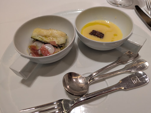 ◆前菜1 グリーンアスパラガスと焼きウニのアミノ酸スープ アスパラの食感がとても素晴らしかったです。 ◆前菜2 温かいポテトのティンバッロとキャビア こちらは別途2500円かかるが是非食べてほしいと予約時に言われオーダー。確かに食べた方が良いです。 とてもとても美味しかった。ポテトの上に溶けて広がるバター、キャビアのハーモニーが絶妙でした。 ◆前菜3 甘鯛の魚醤付け焼きと空豆 すだちの香りで お魚も空豆もホクホク加減は良かったですがあまり好みではありませんでした。 ◆パスタ1 蛍イカとほろ苦いふきのとう、いろいろな山菜のキタッラ ふきのとうはじめ山菜がとても美味しかった。 ◆パスタ2 筍と鴨モモ肉のコンフィのタリオリーニ 木の芽ジェノベーゼ 何とパスタが2種も出てきました。この時点でかなりお腹いっぱいになっていましたが、鴨肉の柔らかさに感動したのと、山椒が良いアクセントになっており、粉チーズを好みでかけ足せるので途中途中で味変も楽しめた為ぺろりと完食してしまいました。 ◆メイン 国産黒毛和牛の炭火焼ロースト 色々なナッツのソース お肉をお肉で巻いた状態で出てきた黒毛和牛。ボリュームあり満腹で完食できるか不安でしたが、これもまたソースとの相性、お肉の柔らかさと美味しさが勝り完食しました。 ◆本日のデザート 6種類から選べます。私は「温かいチョコレートのムース 国産柑橘のクリアなマルメラータ...
