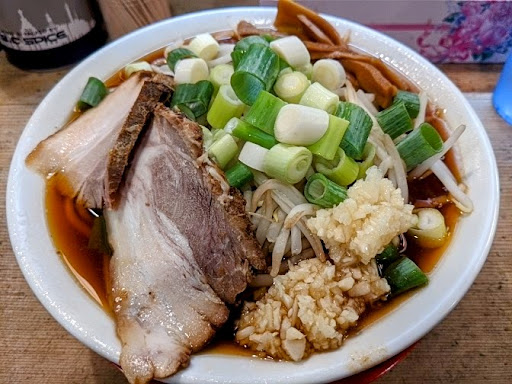 【トッピング】 柔らかチャーシュー、もやし、背脂、メンマ、ぶつ切りねぎ、大量ニンニク