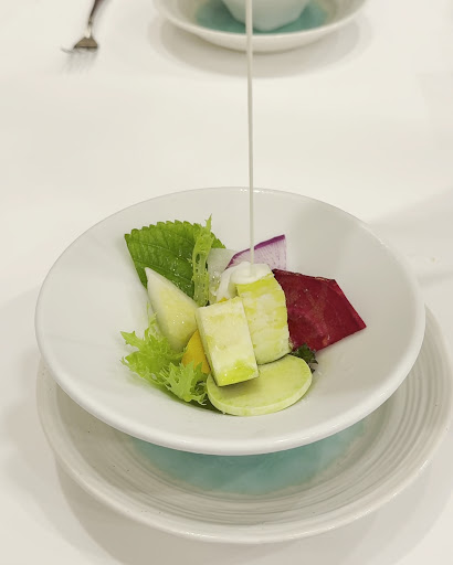 奈良の契約農家さんから仕入れたというサラダはフレッシュで素敵でした🥗 トロンボーンズッキーニ、ビーツ、ラディッシュ、サラダケール、泉州の水茄子、真桑瓜、コリンキーが入っており特に水茄子と瓜の甘さが好きです 蔵王の極みヨーグルトとシークワーサーのドレッシングも爽やかです